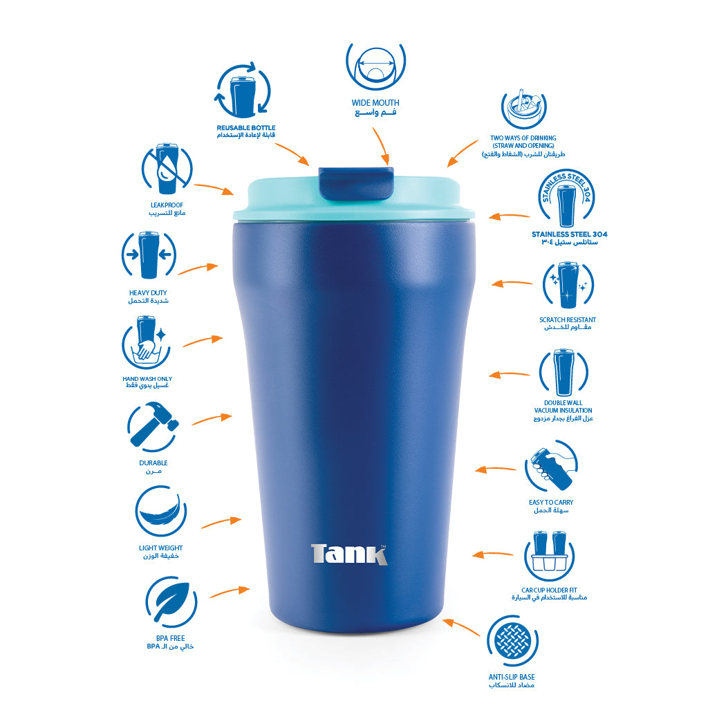 • عزل مزدوج الجدار بتقنية التفريغ الهوائي لضمان أقصى احتفاظ بدرجة الحرارة لمدة تصل الى ٢٤ ساعة للمشروبات الباردة و لمدة تصل الى ٦ للمشروبات الساخنة
