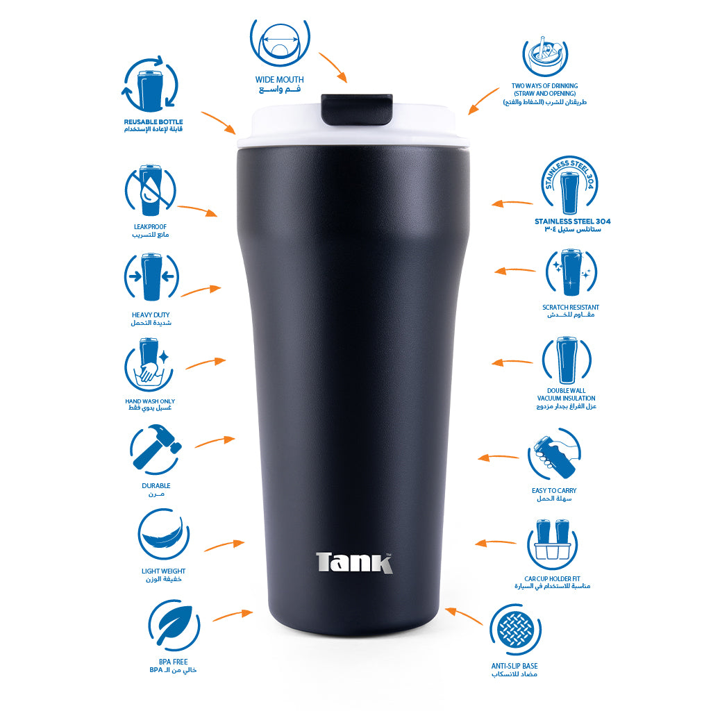 • عزل مزدوج الجدار بتقنية التفريغ الهوائي لضمان أقصى احتفاظ بدرجة الحرارة لمدة تصل الى ٢٤ ساعة للمشروبات الباردة و لمدة تصل الى ٦ للمشروبات الساخنة