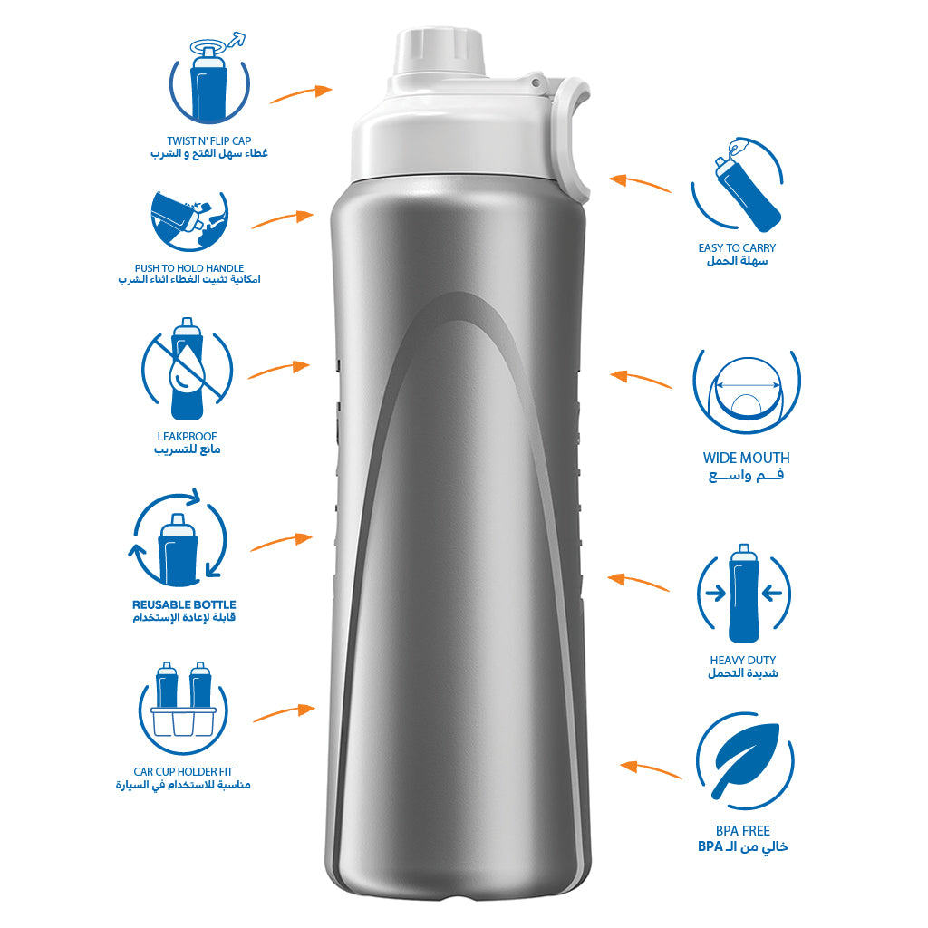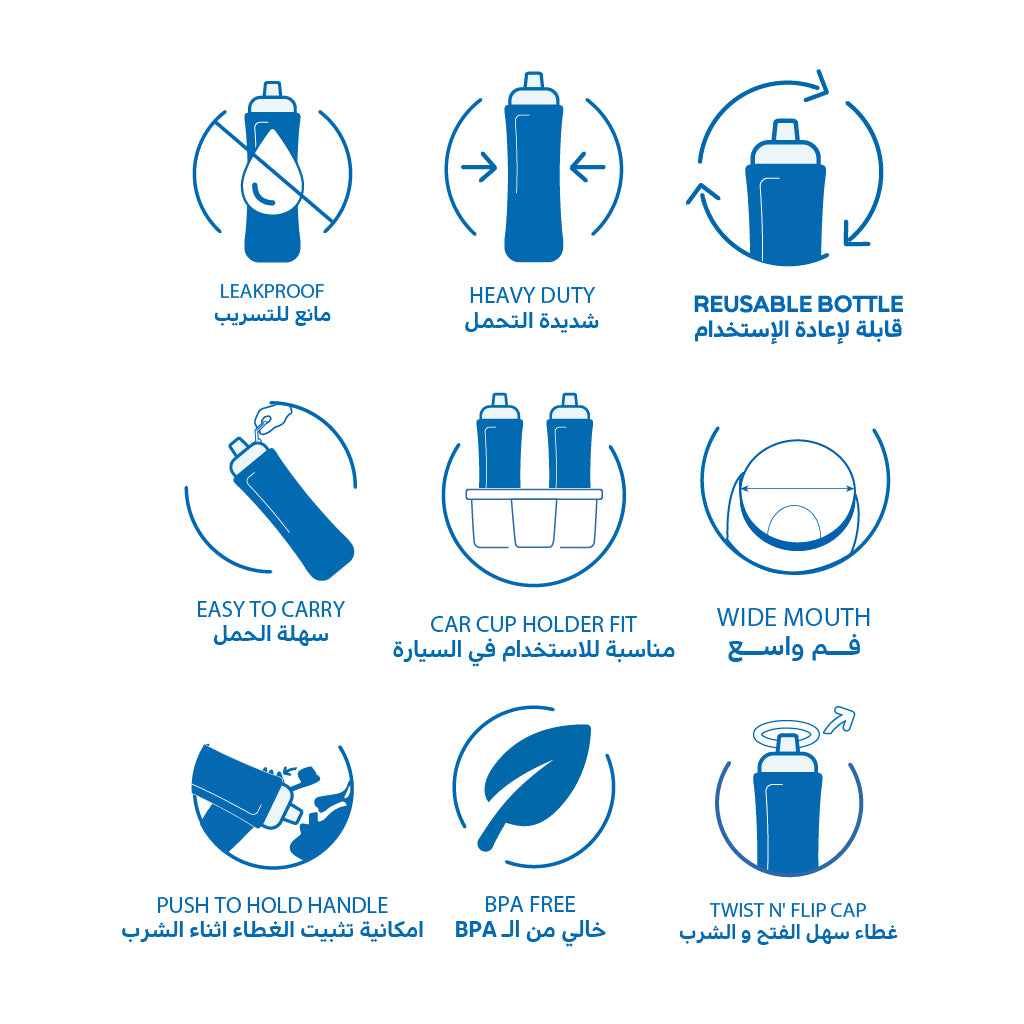 الزجاجة مصنوعة من مادة البولي بروبيلين (PP5)، وهي مادة صالحة للطعام، وآمنة وصحية ومعتمدة من إدارة الغذاء والدواء الأمريكية